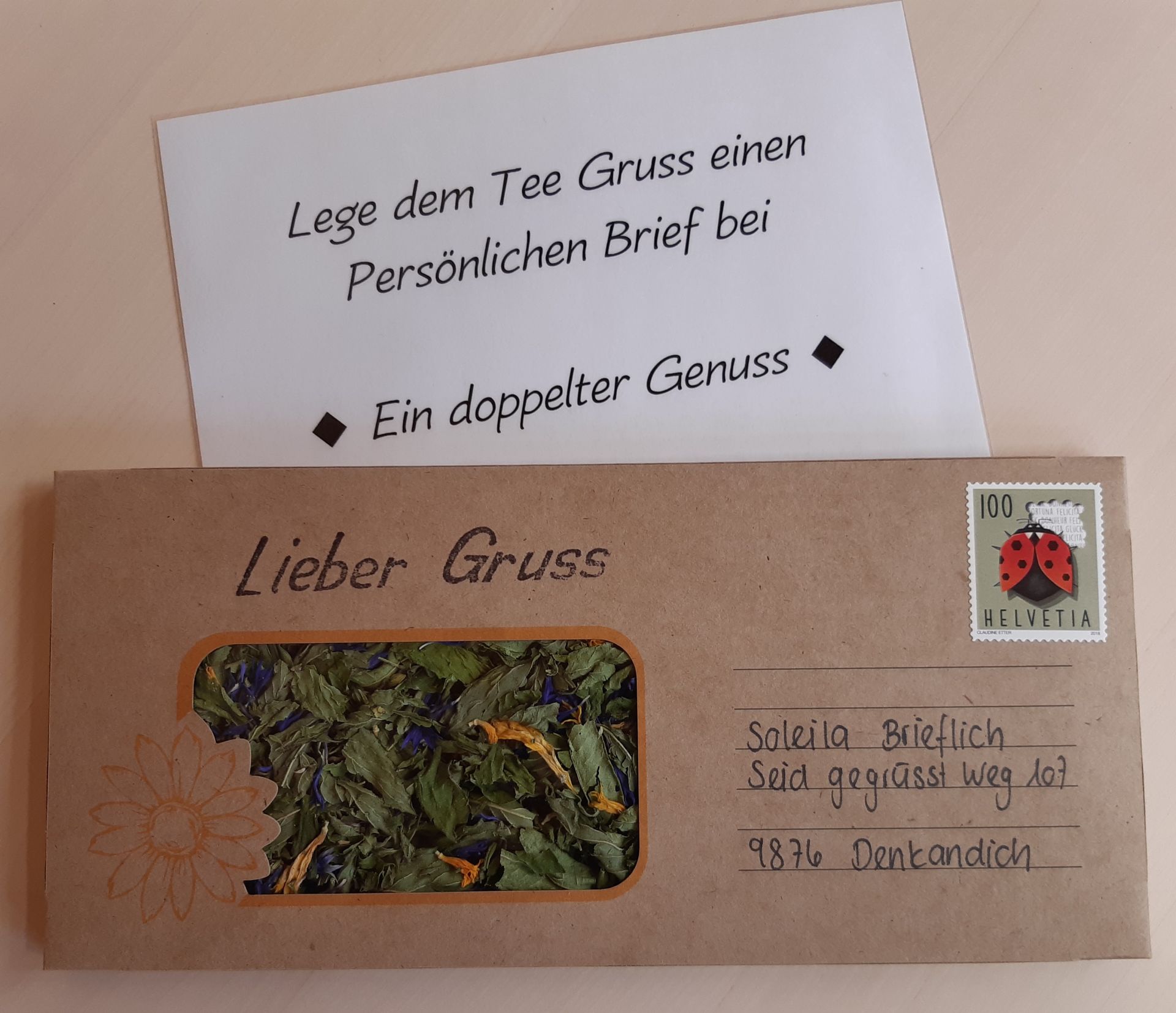 Besonders Freude können Sie mit unserem Tee-Gruss verschicken: Adresse draufschreiben, Marke aufkleben, ein persönlicher Gruss ins Karton stecken und ab zur Post.